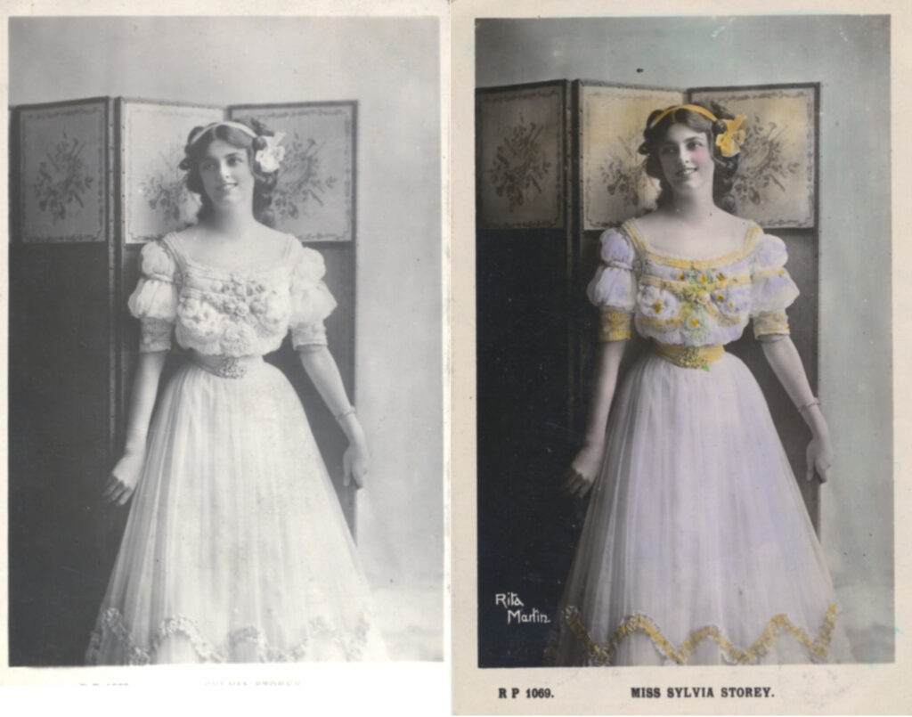 Gaiety Girls were to be seen in chorus lines and were reputed to be more refined than other dancing girls in the music hall. As well as dancing they often posed for postcards and cigarette cards. Above you can see Sylvia in both black and white and colourised. Purists tend to frown on the practice of colourising old photographs today but it was common practice in the early twentieth century. The process of colourisation was carried out by “hand tinting” though this effect was was achieved in different ways.
