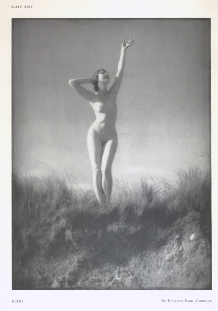There’s an unusual number of nudes in this volume – eight in total. I’ve picked out “Echo” for a couple of reasons. Firstly it references Greek mythology this time, where Echo is a mountain Nymph cursed by Hera to only repeat the last words she hears until she fades away leaving only her voice. Secondly the photographer is Betram Parks, who together with his photographer wife Yvonne Gregory, were some of the most interesting artists of their day. Famed for society portraits and producing publicity images for theatrical performances they were also well-known for their female nudes. They published several books including the 1935 “The Beauty of the Female Form.” (About £60 from Abebooks if you’re interested). They also published photographs in naturist publications such as “Health and Efficiency.”